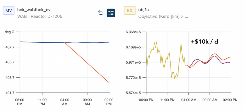 Figure 1: Operators and engineers perform what-if simulations to build trust in AIO models. A manipulation (orange) shows that lowering WABT has a $10k/d increase on the objective function.