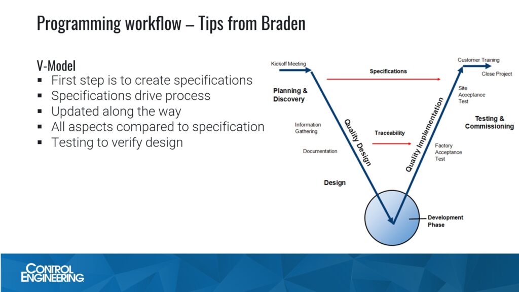The first step is to define scope and create specifications. Depending on industry, this can be a conformed specification from a consulting engineer, a functional requirement specification, software design specification or something similar. This document defines what requirements the program is supposed to meet, and what the outcomes are supposed to be. This can include design for other portions such as hardware, visualization techniques, reporting and historical data management depending on the type of specification. As shown in the V-Model, the specification drives the project or program and serves as the one source of truth for design and implementation. The specification can change along the way, but it should be updated as it is changed and the reason for the change should be documented. Even in industries that don’t require this type of documentation, writing some sort of specification provides one source of truth for how the system is supposed to work and what it is trying to accomplish.