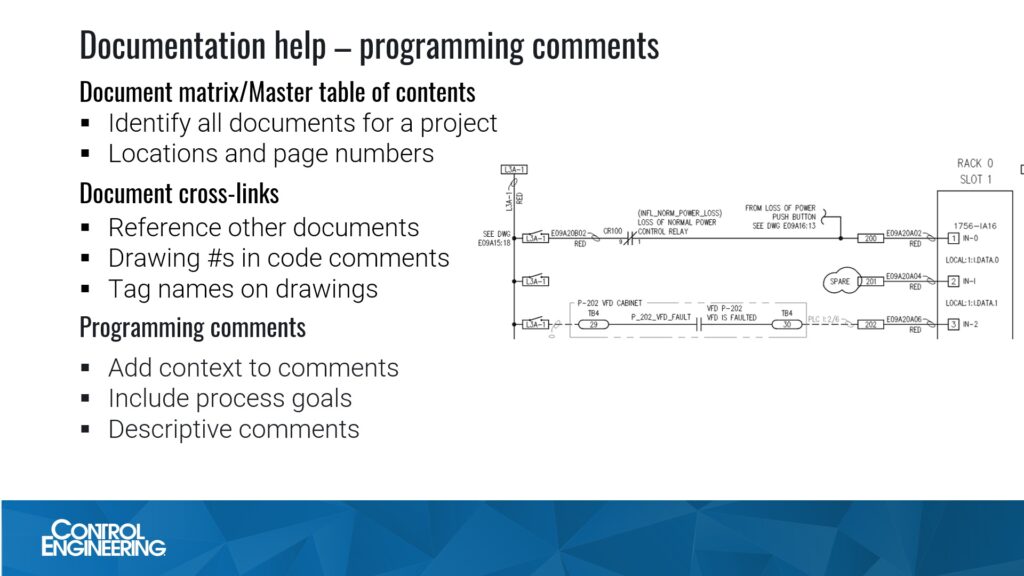 Another practice is to place references to specific documents inside the logic programs such as drawing numbers in I/O mapping routine comments or process piping and instrumentation diagrams (P&IDs) numbers for a specific process, Hadwiger said. Reference control narratives or functional requirement specification document numbers in logic comments can help users find more information. Including comments related to PLC or control system logic in other documents such as PLC addresses and I/O tag names on electrical drawings also can help. The example shows the PLC I/O tag name and the tag to which the point is mapped.