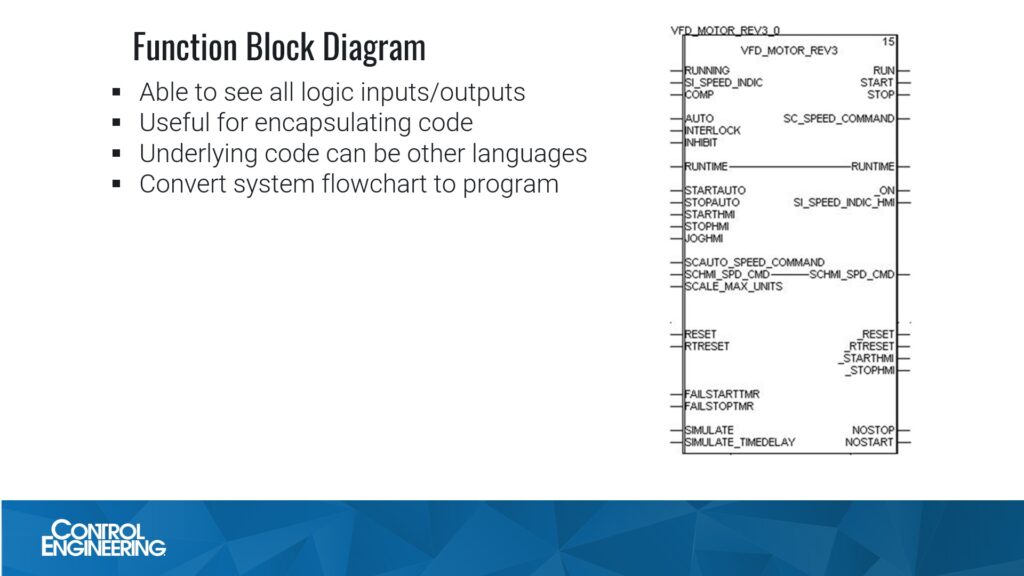 The main advantage of Function Block Diagram, according to Hadwiger, is that it organizes all inputs and outputs for an instruction or custom piece of code into one place and in way that allows seeing all at once. It also allows encapsulation of PLC code often such as the code for controlling a motor or valve. For example, one customer’s custom library of code is written in Ladder logic, but it is encapsulated in Function Block Diagram. This custom code is used for individual pieces of equipment such as a motor with a variable frequency drive. An example of this function block is shown in Figure 12. It’s also worth noting that most modern programming software allows encapsulation of code written in different languages. That provides the ability to create a custom function block whose code is written in ladder logic, function block, SFC or structured text.
