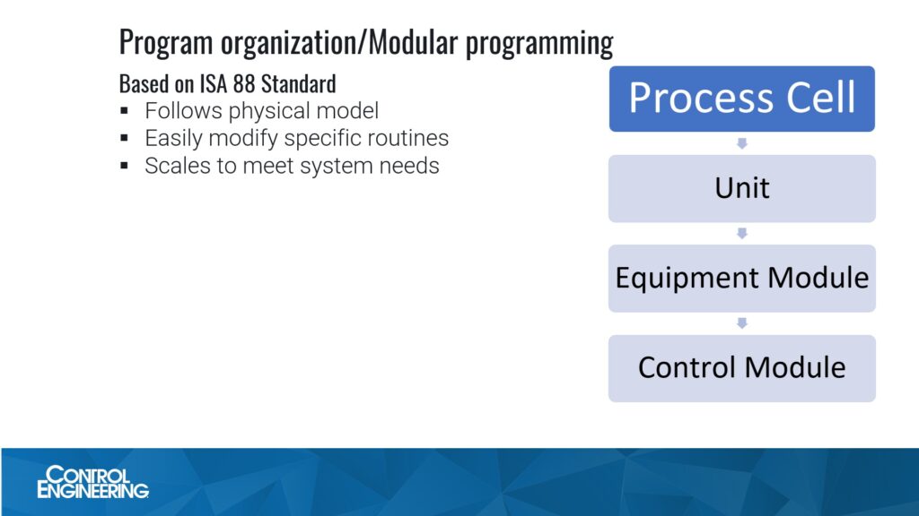 Another benefit to this type of organization, Hadwiger said, is the ability to easily scale programming to the size of system being implemented. More equipment and more processes just need to be added to the programming and don’t require changes to the existing programming. This method is effective for organizing small programs.