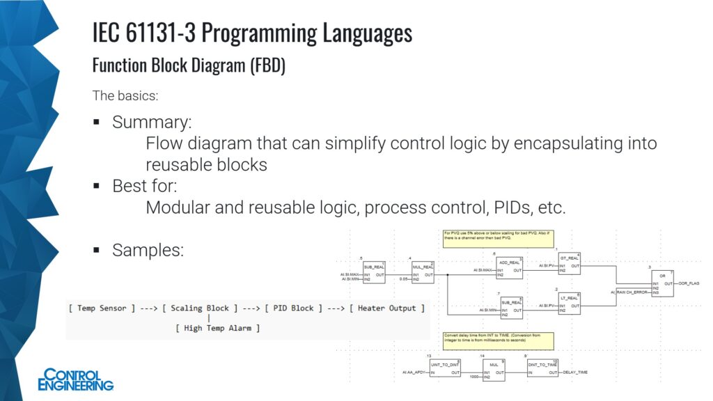 Function Block Diagram (FBD) programming language creates a flow diagram that can simplify control logic by encapsulating into reusable blocks. It’s best for modular and reusable logic, process control, proportional-integral-derivative controls (Figure 3). FBD was derived from block-oriented control diagrams used in the process control industry. Key functions include signal processing and PID loops. It is popular in process industries like chemical plants, refineries, water treatment and other process applications. It can be harder to debug than LD, uses more memory and can become more cluttered without care. It’s highly scalable with function block libraries.