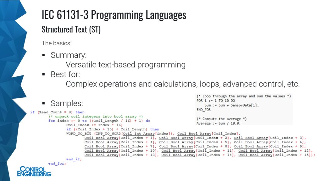 Structured Text (Figure 4) is versatile text-based programming, best for complex operations and calculations, loops, advanced control and related applications, Israelsen said. Derived from other languages like Pascal and C, key functions are items like looping, heavy math and data processing. It’s gaining popularity, he said, especially with items like PC-based control. Structured text is non-graphical, so less intuitive for non-programmers and subject to syntax errors. ST is very scalable.