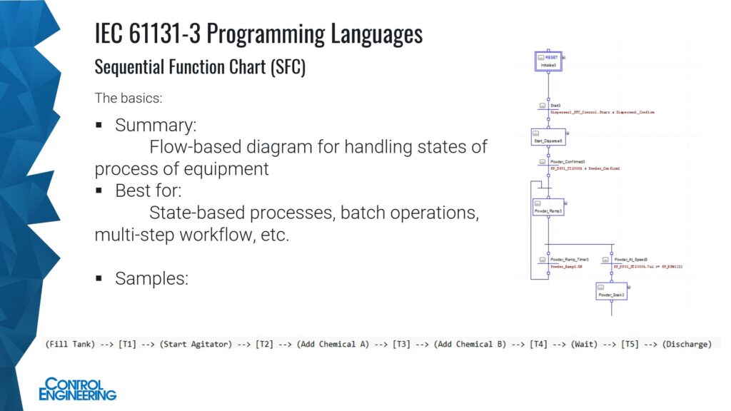 Israelsen said SFC is derived from a French state-machine standard for process control (Grafcet). Key functions are for batch processing and state-driven automation. SFC is popular in pharmaceuticals, chemical processing, robotics, etc. However, it is not standalone (needs to pair with our languages), limited for high-speed control and can be difficult to debug. It scales well for state-based logic.