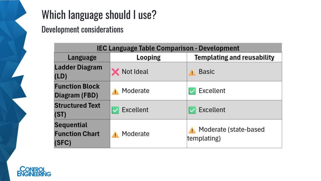 When deciding which control programming language to use, Israelsen said, consider process (what you are controlling), platform (what tools you have), environment (where you are working) and development needs (maintenance and scaling). The answer may be to use multiple languages. Israelsen cautioned programmers not to fall into the trap of just using what you like or “we have just used that.” Thinking like that is a “trap because you could work yourself into a corner.” Be intentional about what language you will use (make a specific decision).