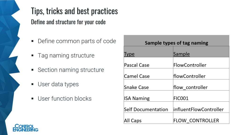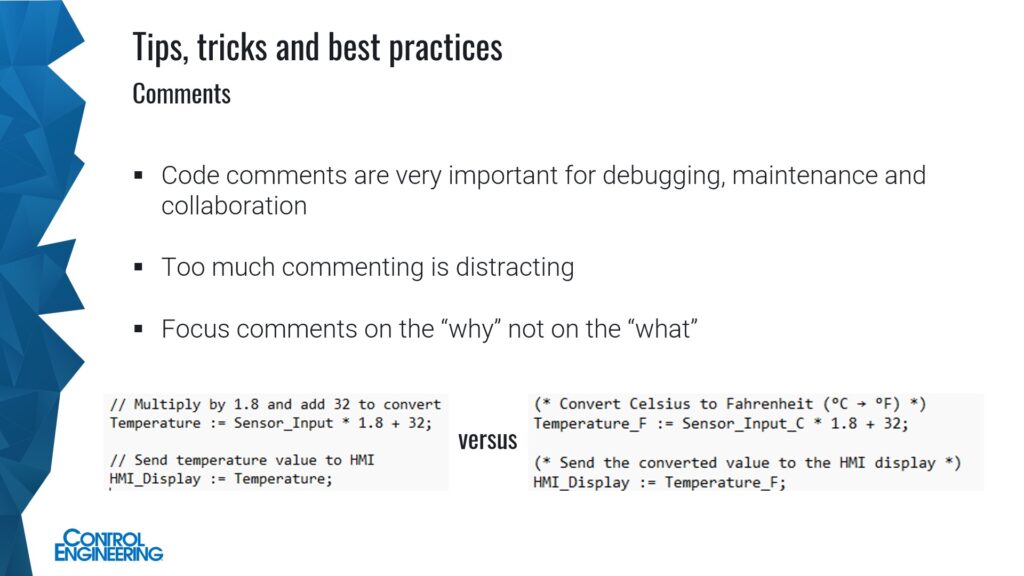 Tips, tricks and best practices for controls and automation programming can include workflow, control programming library hygiene and documentation help.