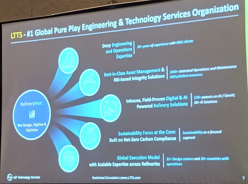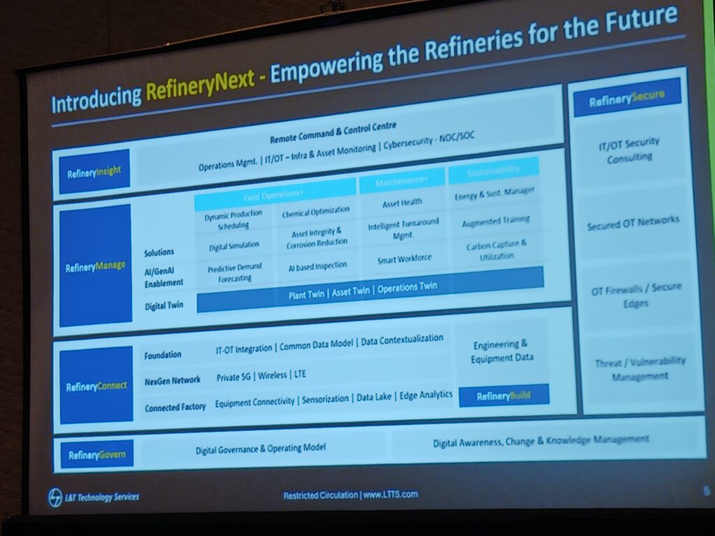 Because 60% of refineries are more than 40 years old, automation and other assets and operations need help, explained Subrat Tripathy, chief segment officer-process industry, L&T Technology Services (LTTS) at the ARC Industry Leadership Forum 2025. During an ARC Advisory Group news conference, Tripathy discussed how to enable the refinery of the future with purposeful, agile engineering. Existing refineries face multiple challenges related to reliability and efficiency, safety, energy consumption and regulatory compliance. For example, the digital twin for plant operations can improve yield and efficiency 5-10%, reduce safety incidents 8-10% and reduce the defect rate 10-12%.