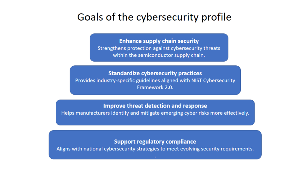Aligned with the 2023 National Cybersecurity Strategy’s goal of strengthening supply chain security for information, communications, and operational technology, the White House Office of the National Cyber Director (ONCD) included a Cybersecurity Framework Profile under initiative 5.5.5 in the National Cybersecurity Strategy Implementation Plan Version 2. SMCC identified a need for a cybersecurity profile specific to semiconductor manufacturing and formed a working group (WG4) in collaborationwith the federal government to develop it. WG4 authors include representatives from Advanced Energy Industries, Applied Materials, ASML, IBM, Intel, PEER Group, Texas Instruments, Tokyo Electron Limited and TxOne Networks.