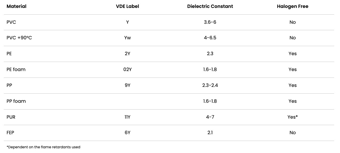 Modern bus and Ethernet cables primarily use materials such as polyethylene (PE) or polypropylene (PP), which provide especially good insulation due to their dielectric constants (εr). The lower this value is, the better the material is at insulating, and the lower the capacity of the cable. This is why thinner insulation can be used when the same dielectric strength is required.