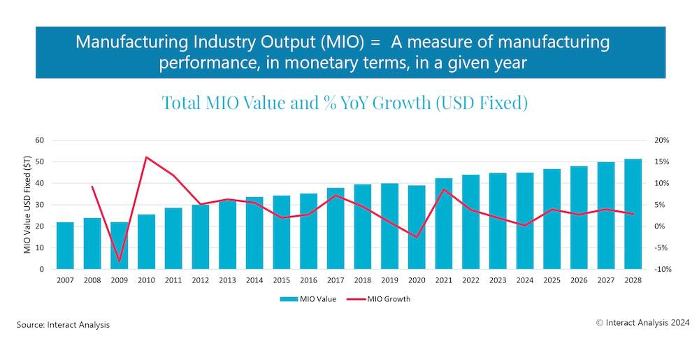 Although Interact Analysis has lowered growth forecasts for 2025 in its latest Manufacturing Industry Output Tracker (MIO), this is the result of a slightly improved global outlook for the end of 2024, which will in turn see most economies finish the year in a stronger position. A slight dip in the growth rate is anticipated in 2026, but manufacturing output is expected to maintain a relatively steady positive trajectory out to 2028.