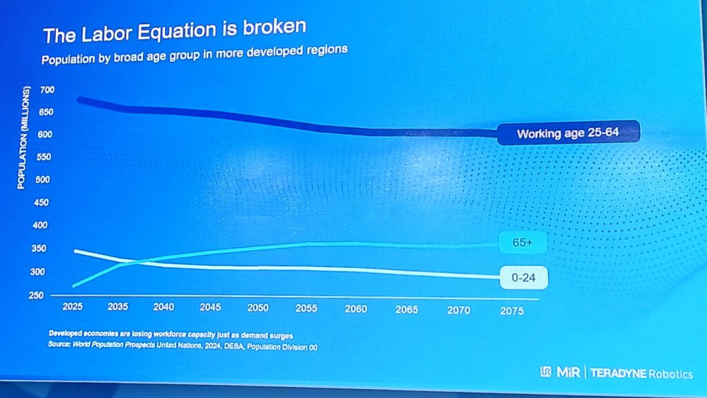 Kumar drew comparisons between his first job at GM in 1999 and today. “Now I see a lot of problems ready to be solved, and the whole ecosystem has to work together. We are in the front seat with several of you to solve labor, ergonomic and other challenges.” The labor equation is broken across industries with too few skilled workers available (Figure 2). United Nations 2024 numbers show that developed economies are losing workforce capacity as demand surges. Population 65 and over will exceed those 24 and younger soon after 2035, he noted.
