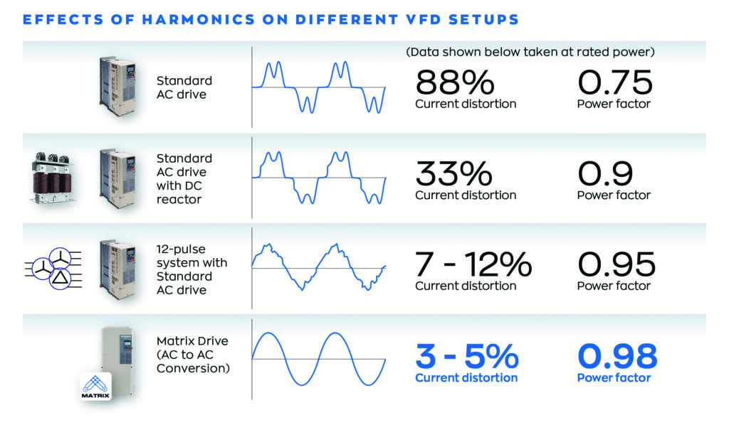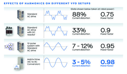 The power conversion process on a 6-pulse drive may create harmonics (voltage or current distortion) that could adversely affect operation of other equipment on the power system or standby generators.