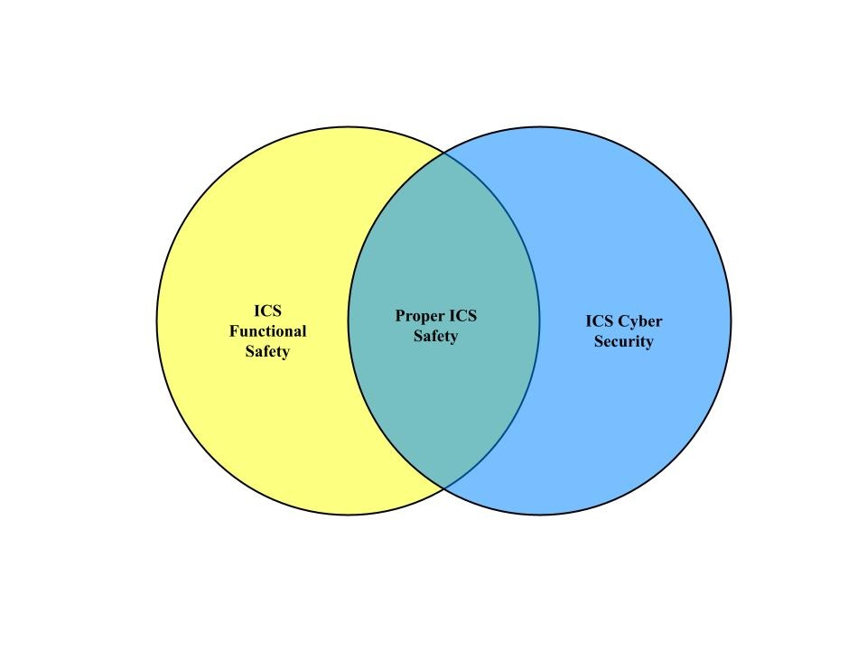 The figure shows that proper ICS safety means both functional safety and cybersecurity must be met and must be integrated. Proper ICS safety can be achieved when both areas are adequately addressed.
