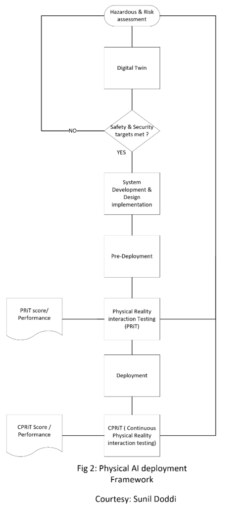 Before deploying any physical AI system, it should undergo a physical reality interaction test (PRiT), analogous to a site acceptance test (SAT) in IACS environments. PRiT should include a scoring system, or a “physical realism score,” modeled on a risk-matrix framework, with defined quantitative or qualitative criteria. Initially, the industry may rely on qualitative or semi-quantitative scoring; over time, fully quantitative metrics may be developed. PRiT results must directly inform the system’s risk assessment, ensuring that identified vulnerabilities are addressed before release.