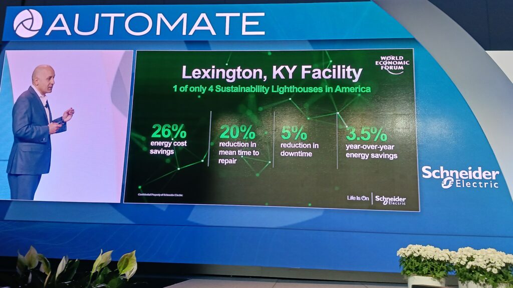 Figure 3: Manufacturing advances in Lexington, Kentucky, include include 26% energy cost savings and 20 reduction in mean time to repair said Aamir Paul, president, North America Operations, Schneider Electric, at Automate 2025. Courtesy: Mark T. Hoske, Control Engineering, WTWH Media