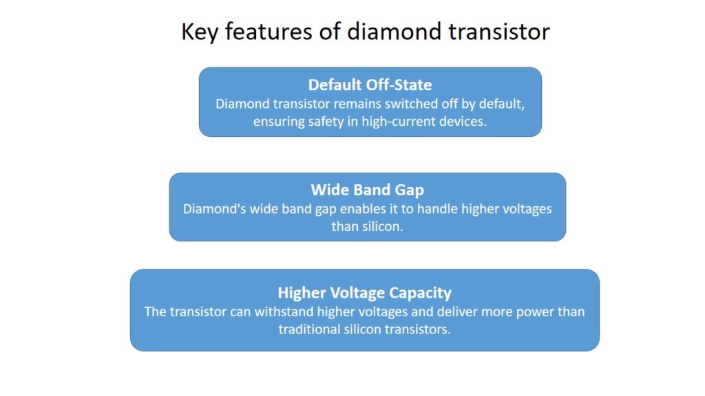 Their diamond transistor needs six volts to activate, more than twice the voltage compared to previous diamond transistors, while continuing to provide high current when activated.