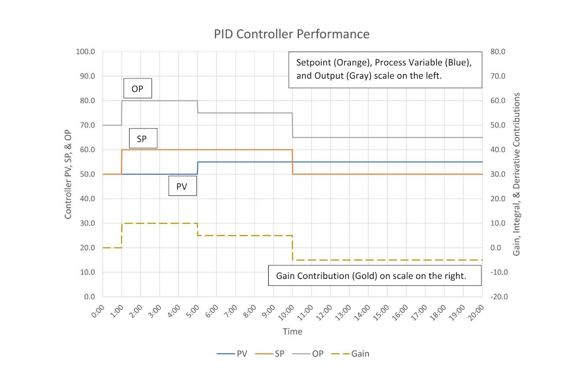 Relative to Figure 1 we see that the Gain contribution (gold) moves up 5% when the SP is moved up 10% @ the 1-minute mark, reflecting the new gain of 0.5. As expected, the OP moves 5% up from 70 to 75%. When the PV moves up 5% at the 5-minute mark, the error dropped to 5%, the Gain contribution, and thus the OP, dropped 2.5% (the OP dropping from 75 to 72.5%). Finally, when the SP is dropped 10% at the 10-minute mark the error dropped to -5%, and the Gain contribution dropped 5% to -2.5%, and the OP dropped 5% from 72.5 to 67.5%.