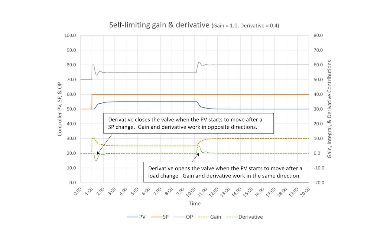 - Derivative works with controller gain in response to process disturbances, providing stronger control. Derivative works the opposite direction of controller gain when the SP is changed, restraining controller response to SP changes. Too much derivative will cause instability.