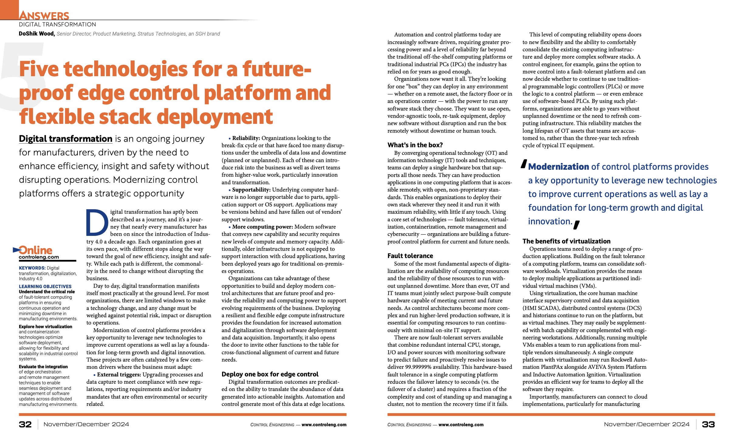 By converging operational technology (OT) and information technology (IT) tools and techniques, teams can deploy a single hardware box that supports all those needs. They can have production applications in one computing platform that is accessible remotely, with open, non-proprietary standards. This enables organizations to deploy their own stack wherever they need it and run it with maximum reliability, with little if any touch. Using a core set of technologies — fault tolerance, virtualization, containerization, remote management and cybersecurity — organizations are building a future-proof control platform for current and future needs.
