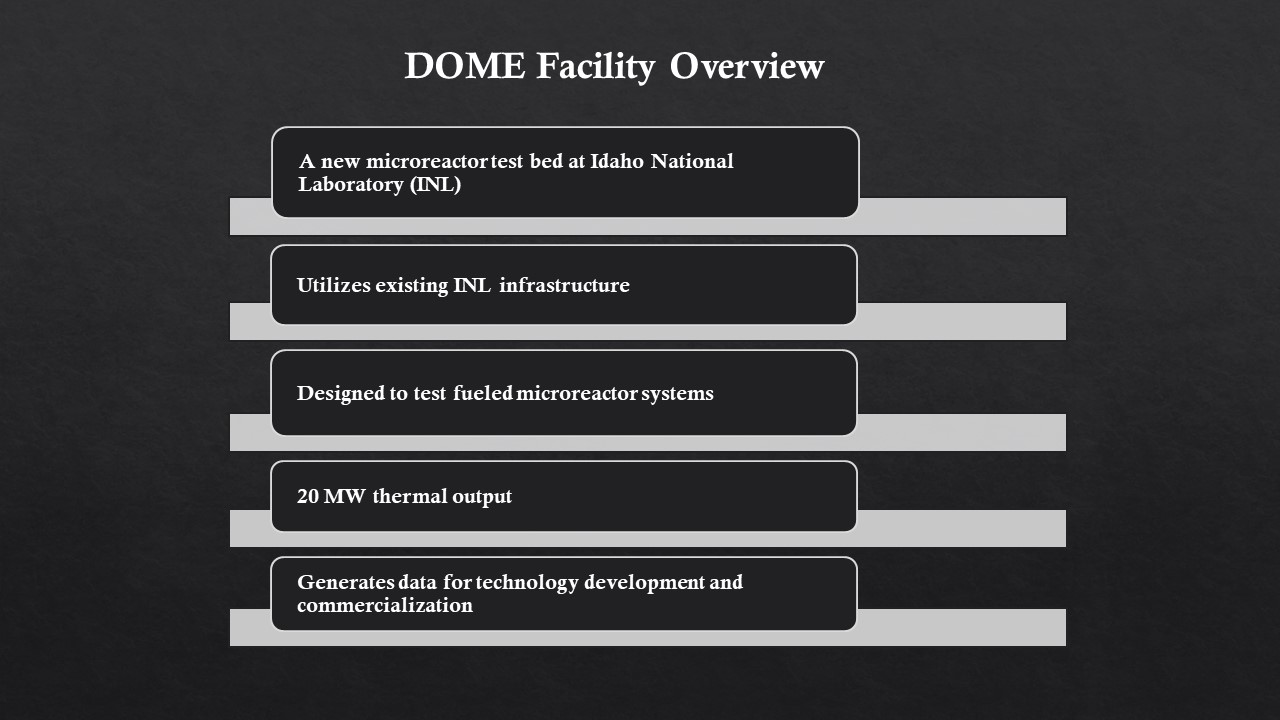 DOME will be a new microreactor test bed facility that uses existing infrastructure at Idaho National Laboratory to test fueled reactor systems capable of producing up to 20 megawatts of thermal energy. Data from these experiments will support the development and potential commercialization of microreactor technologies.