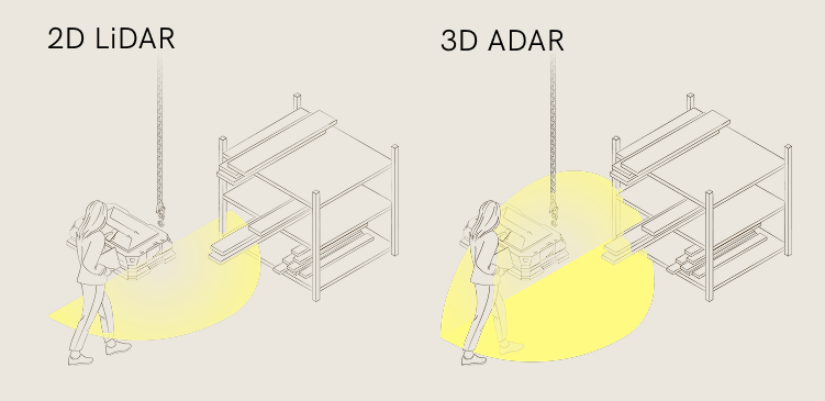 2D safety LiDAR are typically mounted on AMRs at a height of around 20cm (7.9 inches). If there’s an object 10 cm above the floor, LiDAR won’t detect it. If there’s an object that’s hanging from the roof, LiDAR won’t detect it. If there are items sticking out from walls or shelves, 2D LiDAR won’t detect them.