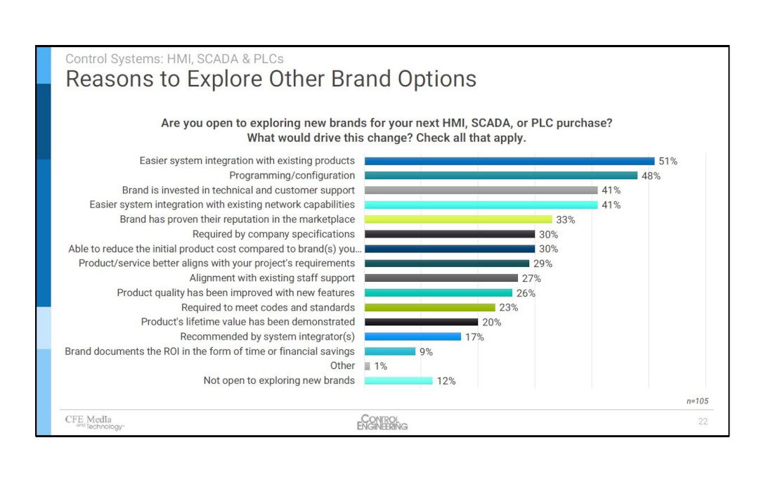 The study results said, “Eighty-eight percent of respondents are open to exploring new brands for their next HMI, SCADA or PLC purchase” (Figure 2). Among leading factors that could drive this change are easier system integration with existing products, programming/configuration, technical and customer support, and easier system integration with existing network capabilities.